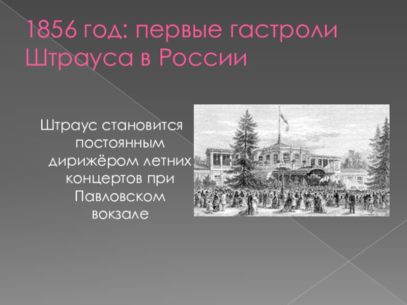 1856 год: первые гастроли Штрауса в России Штраус становится постоянным дирижёром летних концертов при Павловском вокзале