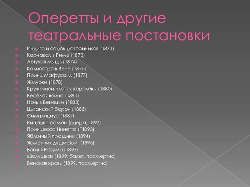 Оперетты и другие театральные постановкиИндиго и сорок разбойников (1871)Карнавал в Риме (1873)Летучая мышь (1874)Калиостро в Вене (1875)Принц