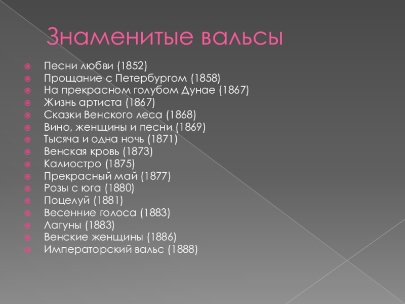 Знаменитые вальсыПесни любви (1852)Прощание с Петербургом (1858)На прекрасном голубом Дунае (1867)Жизнь артиста (1867)Сказки Венского леса (1868)Вино, женщины