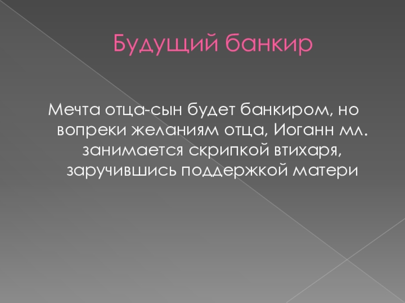 Будущий банкирМечта отца-сын будет банкиром, но вопреки желаниям отца, Иоганн мл. занимается скрипкой втихаря, заручившись поддержкой матери