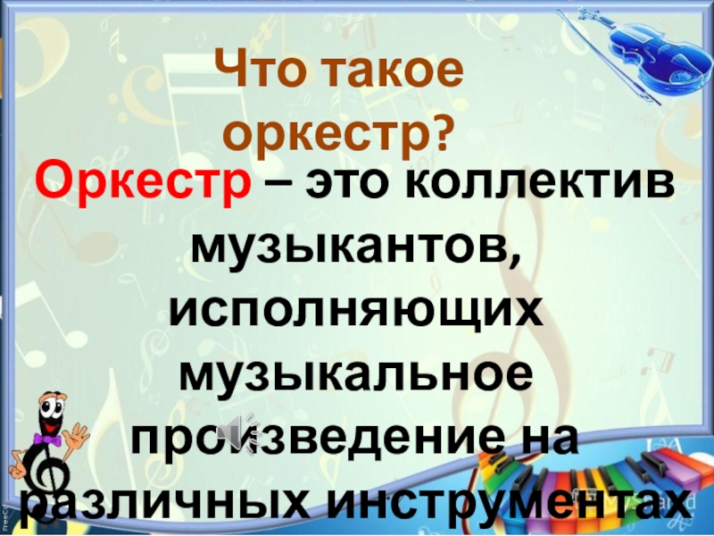 Что такое оркестр?Оркестр – это коллектив музыкантов, исполняющих музыкальное произведение на различных инструментах