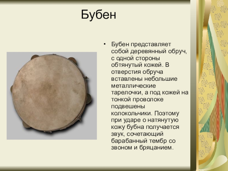 Бубен - ударный музыкальный инструмент с неопределенной высотой звука. Проникнув в