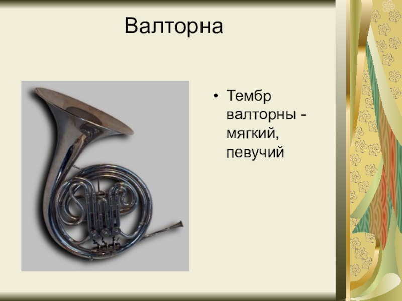 Валторна - медный духовой инструмент, ведущий происхождение от старинного охотничьего рога