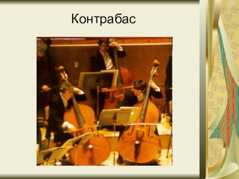 «Предками» контрабаса были старинные басовые виолы. Длина инструмента - около 2 м; играют на контрабасе, сидя на высоком табурете или стоя.