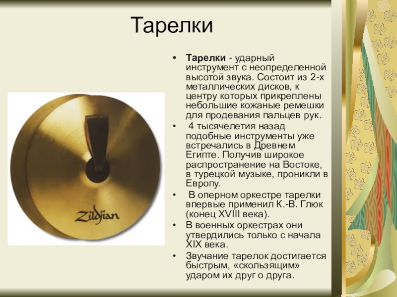 Тарелки - ударный инструмент с неопределенной высотой звука. Состоит из 2-х