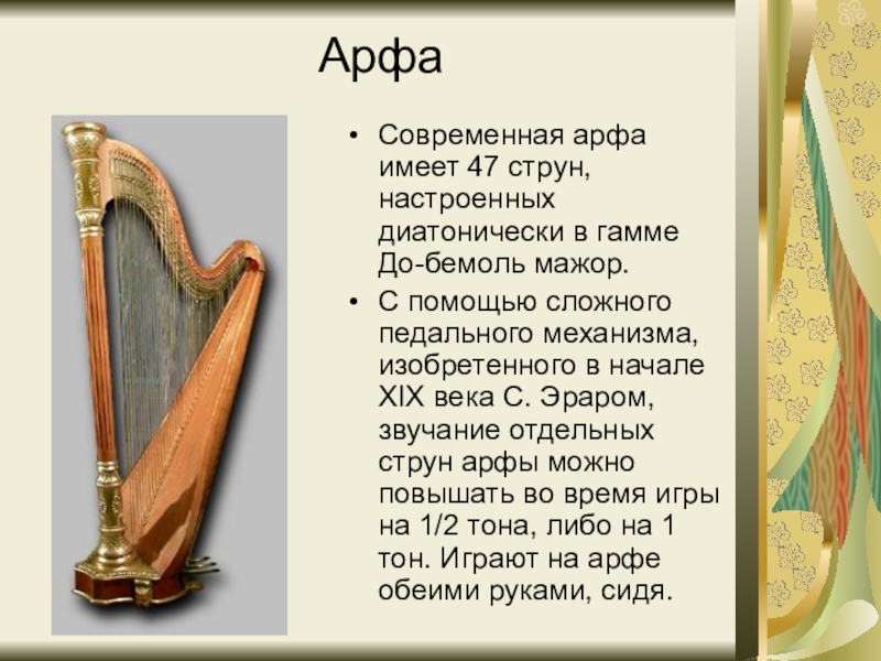 Арфа - струнный щипковый инструмент древнего происхождения. Простейшие типы арф были