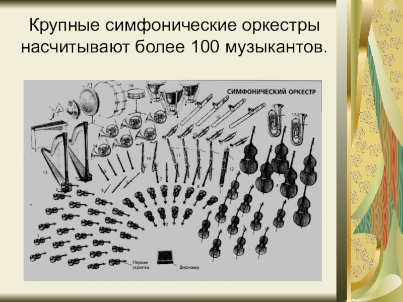 Слайд 4Крупные симфонические оркестры насчитывают более 100 музыкантов.