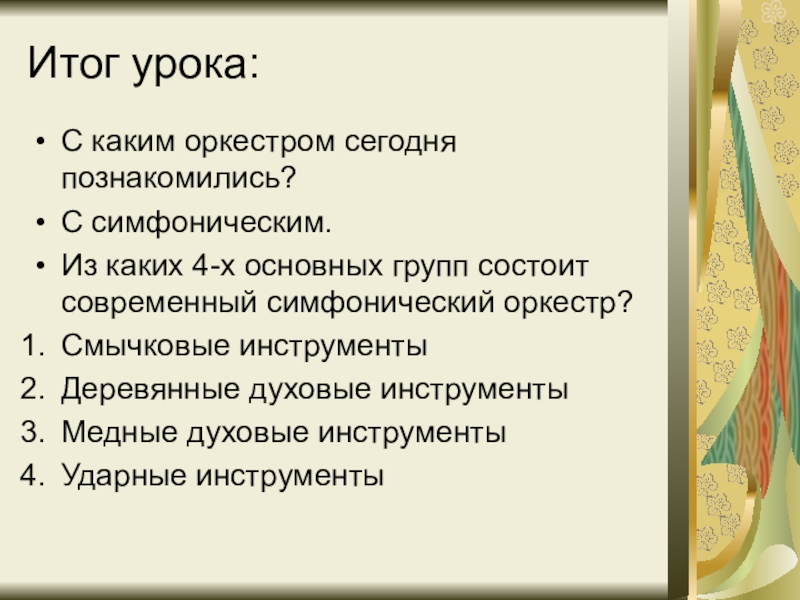 Современный симфонический оркестр состоит из 4-х основных групп.
