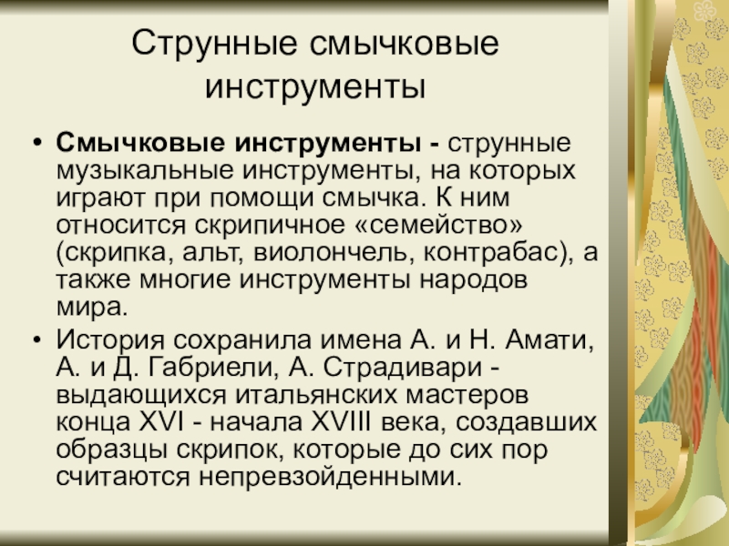 при помощи смычка. К ним относится скрипичное «семейство» (скрипка, альт, виолончель, контрабас), а также многие инструменты народов мира.