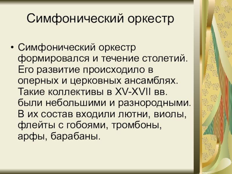 Симфонический оркестр формировался и течение столетий. Его развитие происходило в