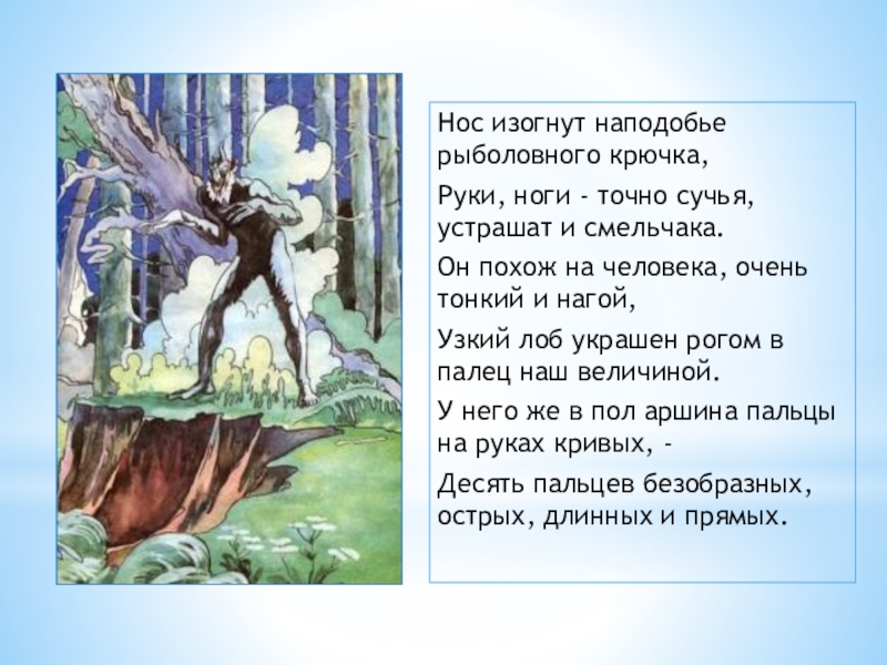 Нос изогнут наподобье рыболовного крючка, Руки, ноги - точно сучья, устрашат и смельчака.Он похож на человека, очень