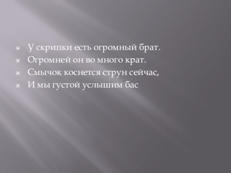 У скрипки есть огромный брат.Огромней он во много крат.Смычок коснется струн сейчас,И мы густой услышим бас