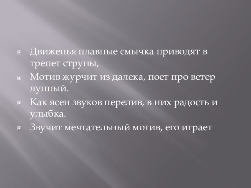 Движенья плавные смычка приводят в трепет струны,Мотив журчит из далека, поет про ветер лунный.Как ясен звуков перелив, в них радость и улыбка.Звучит мечтательный мотив, его играет