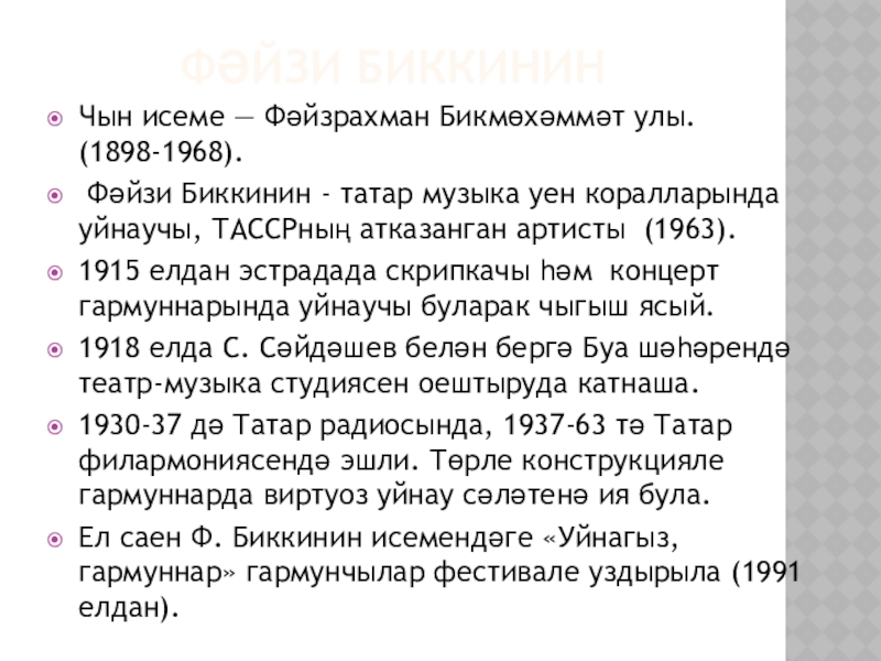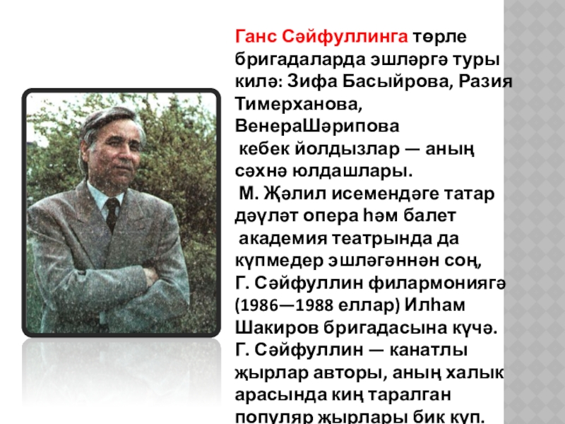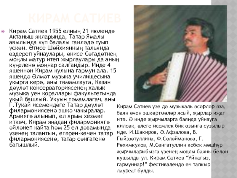Үзенең югары башкару сәнгате белән халкыбыз көйләренең гүзәллеген, байлыгын ул хәтта бүтән халыкларның күңеленә барып җитәрлек итә алган музыкант.
