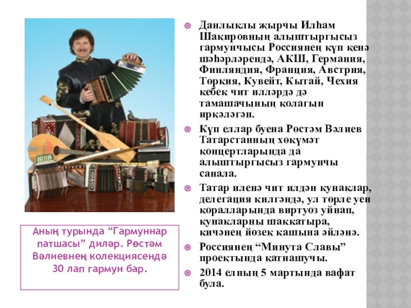 Данлыклы җырчы Илһам Шакировның алыштыргысыз гармунчысы Россиянең күп кенә шәһәрләрендә, АКШ, Германия, Финляндия, Франция, Австрия, Төркия, Кувейт, Кытай, Чехия кебек чит илләрдә дә тамашачының колагын иркәләгән.