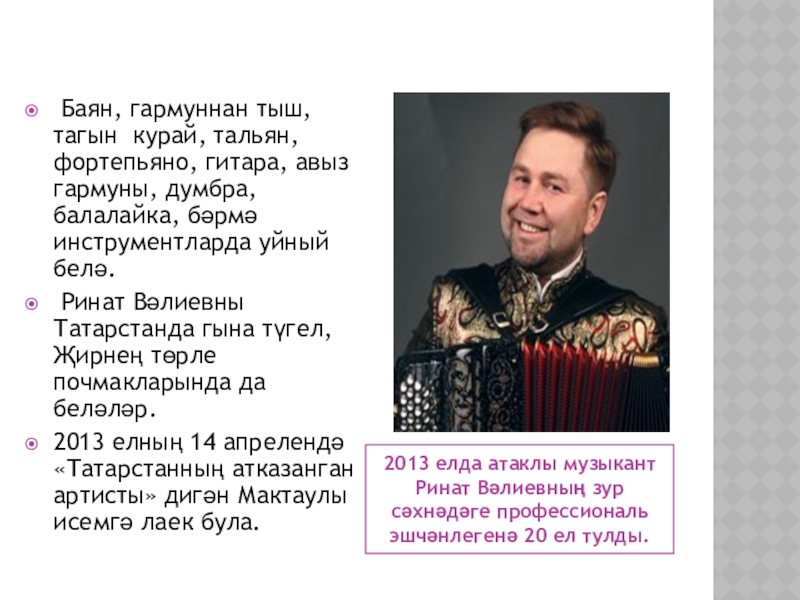 Баян, гармуннан тыш, тагын курай, тальян, фортепьяно, гитара, авыз гармуны, думбра, балалайка, бәрмә инструментларда уйный белә.