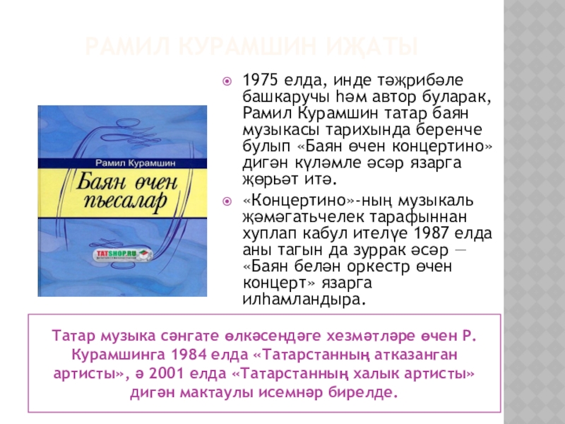 1975 елда, инде тәҗрибәле башкаручы һәм автор буларак, Рамил Курамшин татар баян музыкасы тарихында беренче булып «Баян өчен концертино» дигән күләмле әсәр язарга җөрьәт итә.