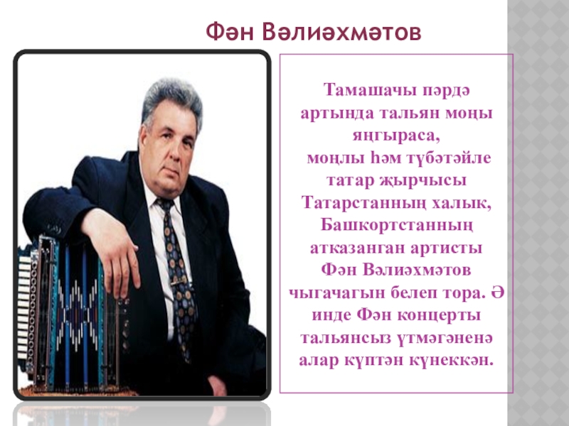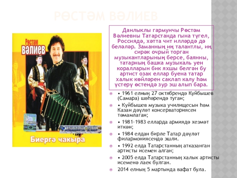 Күп еллар буена Рөстәм Вәлиев Татарстанның хөкүмәт концертларында да алыштыргысыз гармунчы санала.