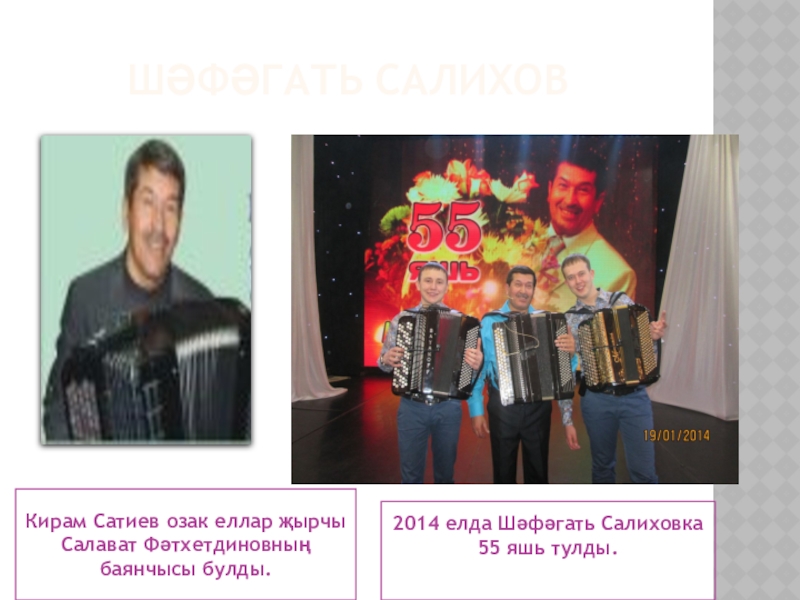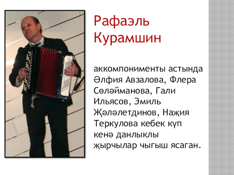 аккомпонименты астында Әлфия Авзалова, Флера Сөләйманова, Гали Ильясов, Эмиль Җәләлетдинов, Наҗия Теркулова кебек күп кенә данлыклы җырчылар чыгыш ясаган.