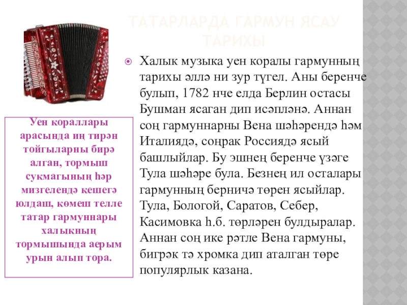 Халык музыка уен коралы гармунның тарихы әллә ни зур түгел. Аны беренче булып, 1782 нче елда Берлин остасы Бушман ясаган дип исәпләнә. Аннан соң гармуннарны Вена шәһәрендә һәм Италиядә, соңрак Россиядә ясый башлыйлар. Бу эшнең беренче үзәге Тула шәһәре була. Безнең ил осталары гармунның берничә төрен ясыйлар. Тула, Бологой, Саратов, Себер, Касимовка һ.б. төрләрен булдыралар. Аннан соң ике рәтле Вена гармуны, бигрәк тә хромка дип аталган төре популярлык казана.