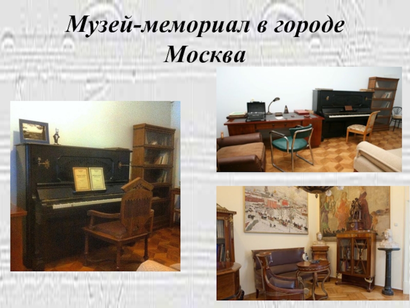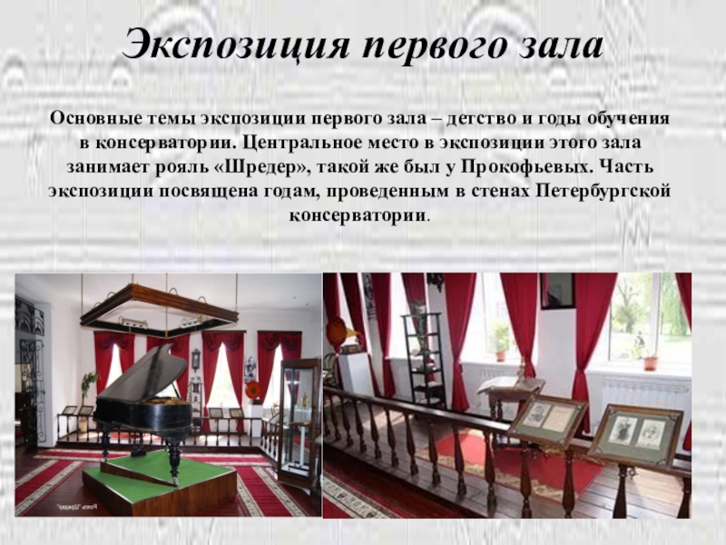 обучения в консерватории. Центральное место в экспозиции этого зала занимает рояль «Шредер», такой же был у Прокофьевых. Часть экспозиции посвящена годам, проведенным в стенах Петербургской консерватории.