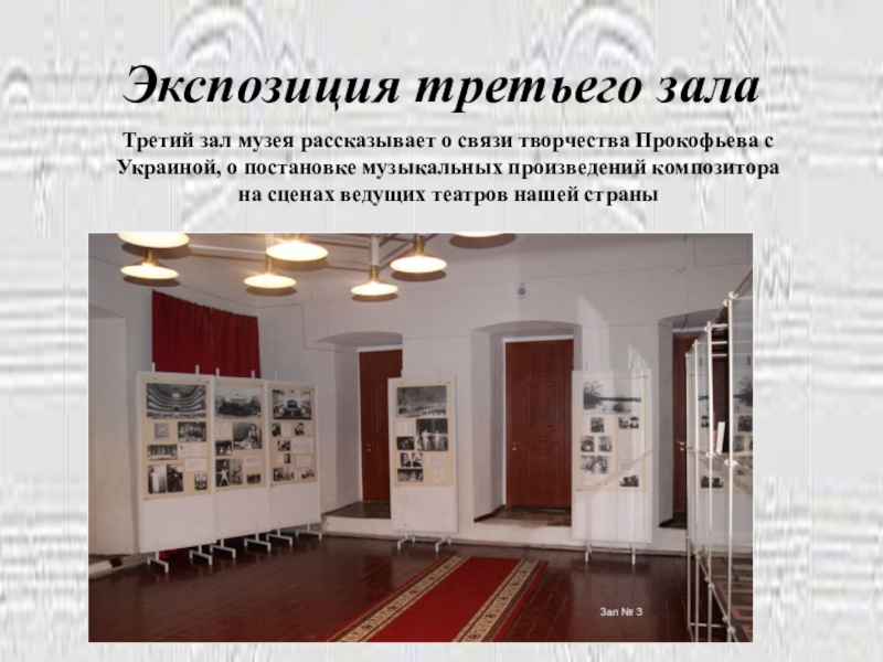 Экспозиция третьего залаТретий зал музея рассказывает о связи творчества Прокофьева с Украиной, о постановке музыкальных произведений композитора
