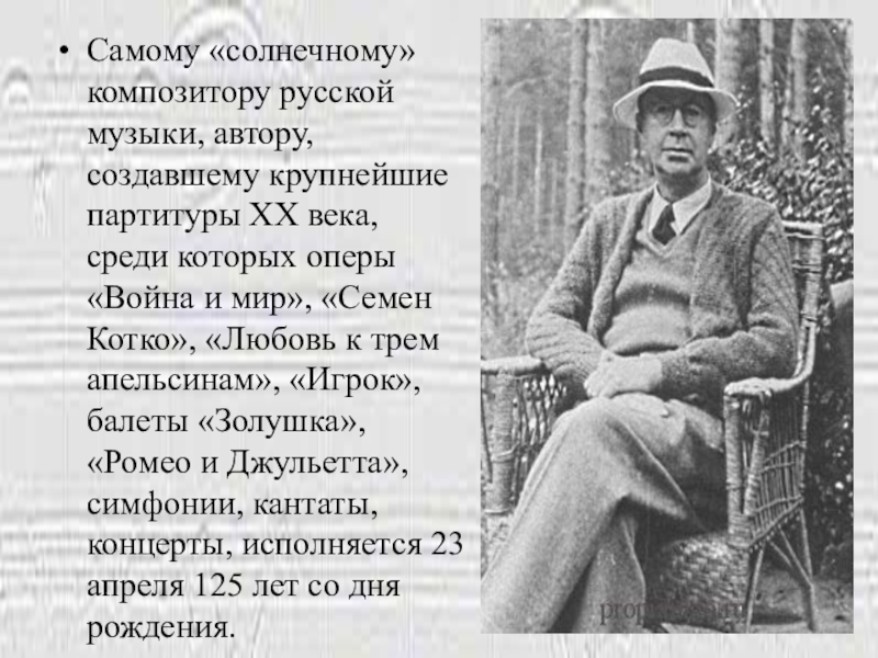 Самому «солнечному» композитору русской музыки, автору, создавшему крупнейшие партитуры ХХ века, среди которых оперы «Война и мир», «Семен Котко», «Любовь к трем апельсинам», «Игрок», балеты «Золушка», «Ромео и Джульетта», симфонии, кантаты, концерты, исполняется 23 апреля 125