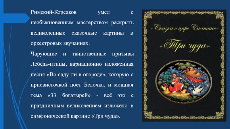 Музыка рисует чудесное превращение Лебедь-птицы в красавицу царевну. Фантастические узоры мелодии, «птичьи в горле переливы» сменяются напевной темой, похожей на русскую протяжную песню. Льётся чарующей красоты мелодия, и поёт тёплый, «человеческий голос» струнных инструментов.