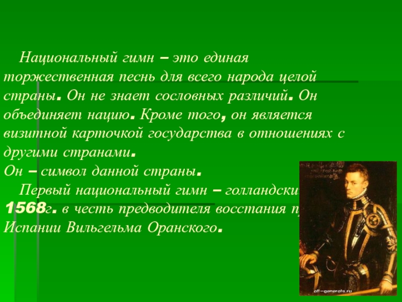 Первый национальный гимн – голландский гимн 1568г. в честь предводителя восстания против Испании Вильгельма Оранского.