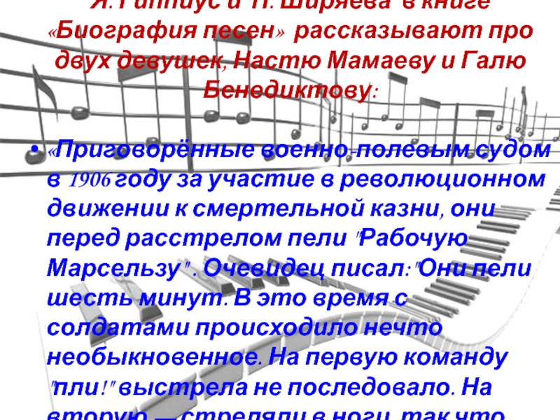 Слайд 15Я. Гиппиус и П. Ширяева в книге «Биография песен» рассказывают про