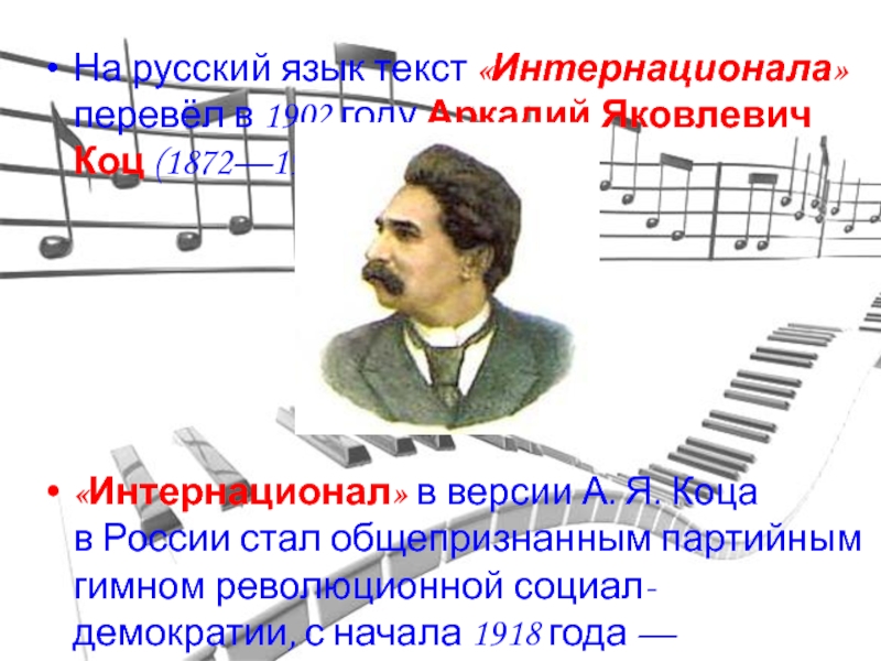 Слайд 22На русский язык текст «Интернационала» перевёл в 1902 году Аркадий Яковлевич Коц (1872—1943).