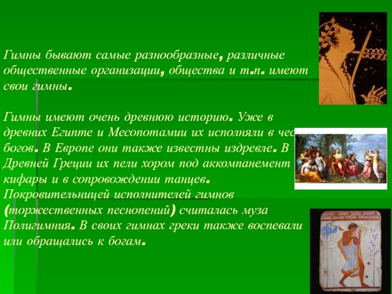 Гимны имеют очень древнюю историю. Уже в древних Египте и Месопотамии их исполняли в честь богов. В Европе они также известны издревле. В Древней Греции их пели хором под аккомпанемент кифары и в сопровождении танцев. Покровительницей исполнителей гимнов (торжественных песнопений) считалась муза Полигимния. В своих гимнах греки также воспевали или обращались к богам.