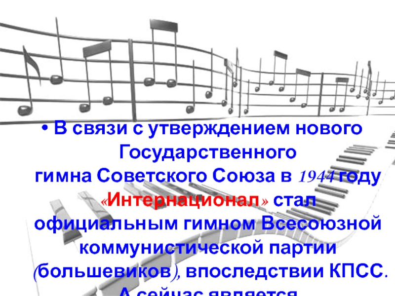 Слайд 23В связи с утверждением нового Государственного гимна Советского Союза в 1944 году «Интернационал»