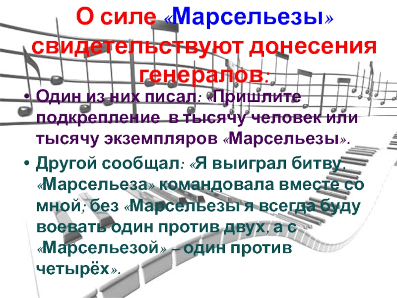 Слайд 8О силе «Марсельезы» свидетельствуют донесения генералов: