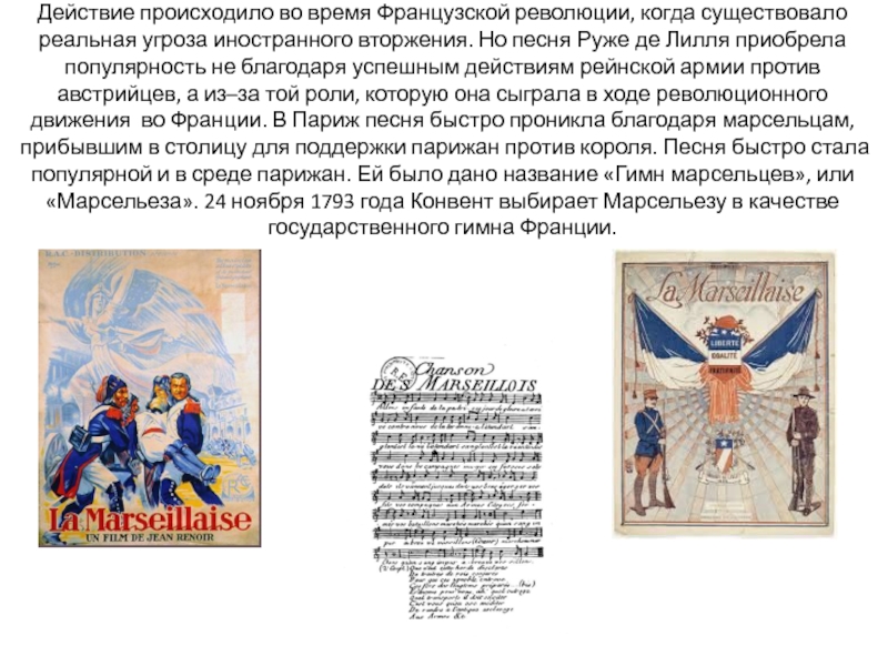 вторжения. Но песня Руже де Лилля приобрела популярность не благодаря успешным действиям рейнской армии против австрийцев, а из–за той роли, которую она сыграла в ходе революционного движения во Франции. В Париж песня быстро проникла благодаря марсельцам, прибывшим в столицу для поддержки парижан против короля. Песня быстро стала популярной и в среде парижан. Ей было дано название «Гимн марсельцев», или «Марсельеза». 24 ноября 1793 года Конвент выбирает Марсельезу в качестве государственного гимна Франции.