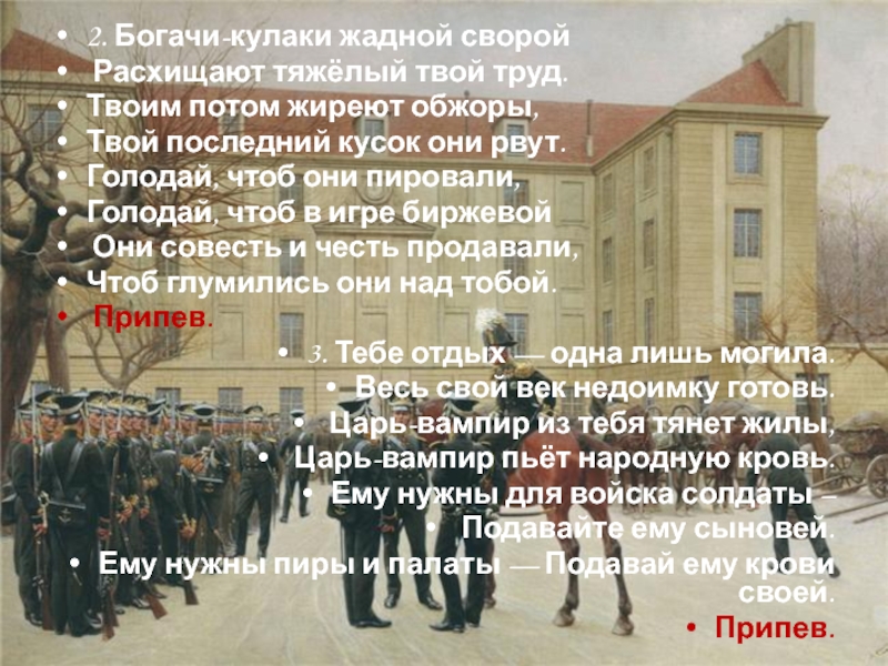 Припев: Вставай, подымайся, рабочий народ!
