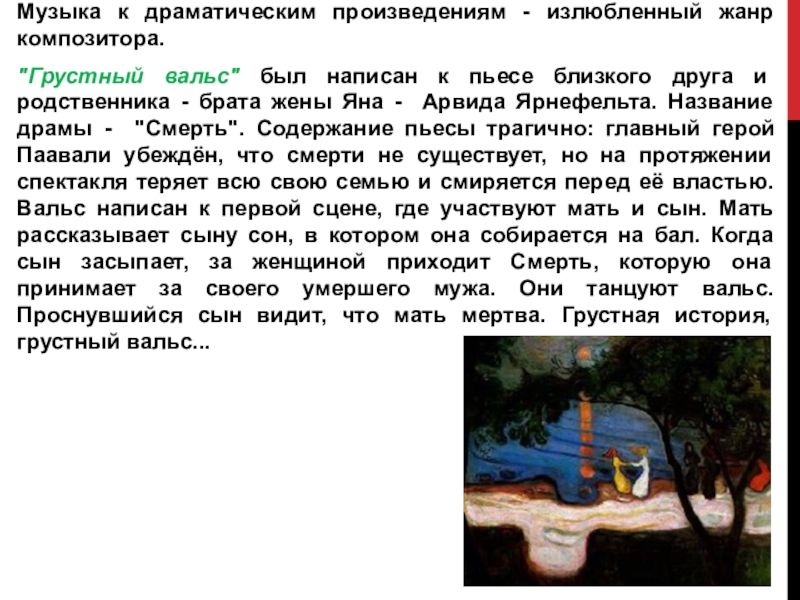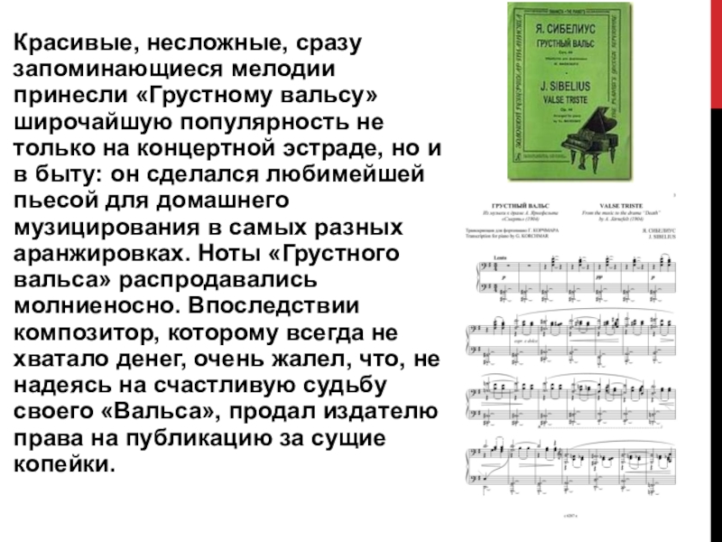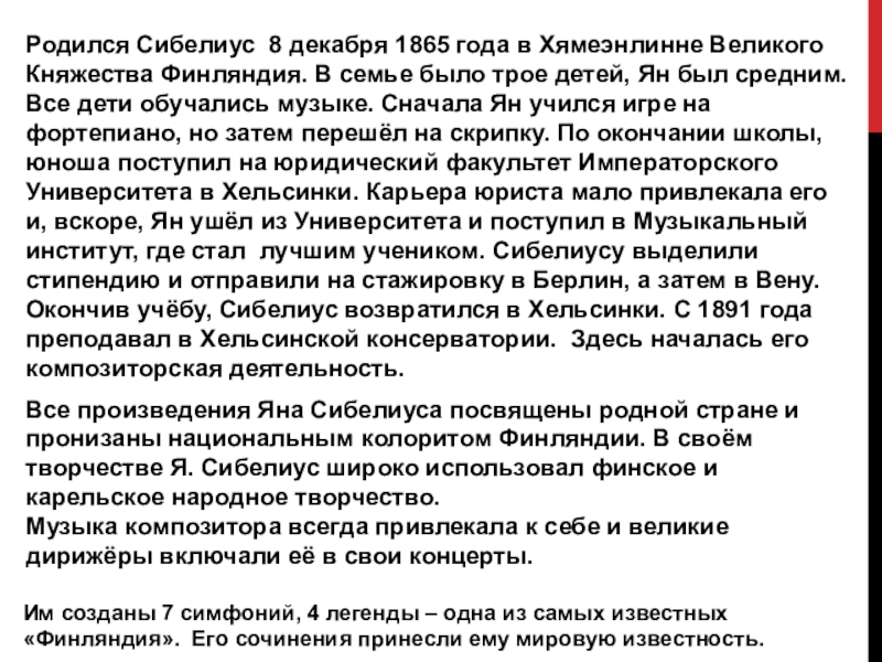 Им созданы 7 симфоний, 4 легенды – одна из самых известных «Финляндия». Его сочинения принесли ему мировую известность.