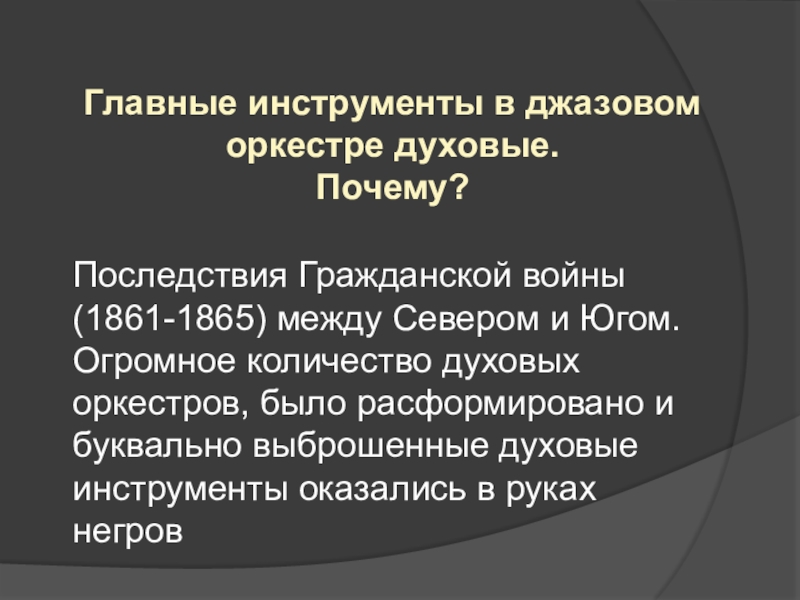 Главные инструменты в джазовом оркестре духовые.Почему?Последствия Гражданской войны(1861-1865) между Севером и Югом. Огромное количество духовых оркестров, было