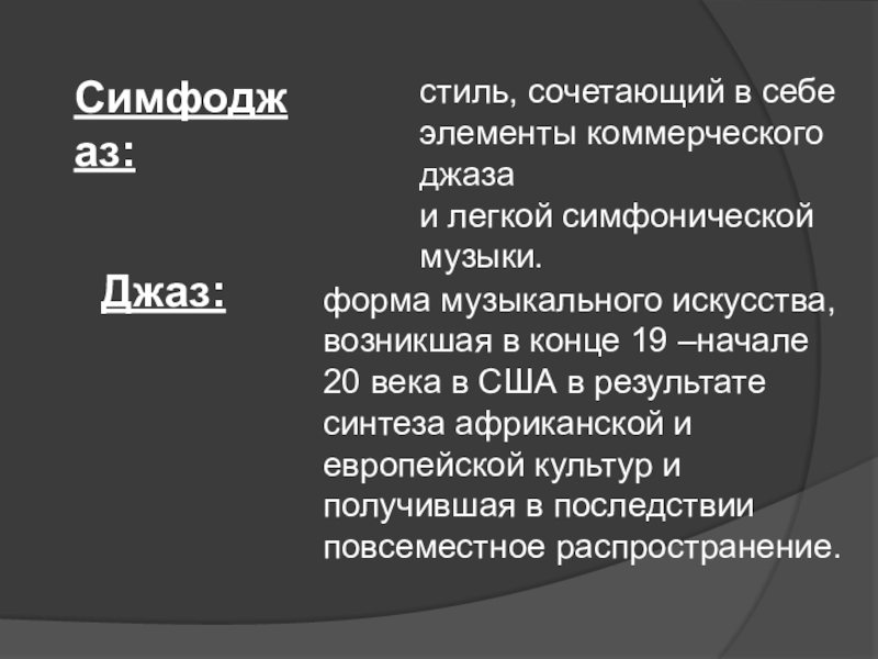 Симфоджаз:стиль, сочетающий в себе элементы коммерческого джазаи легкой симфонической музыки.Джаз:форма музыкального искусства, возникшая в конце 19 –начале