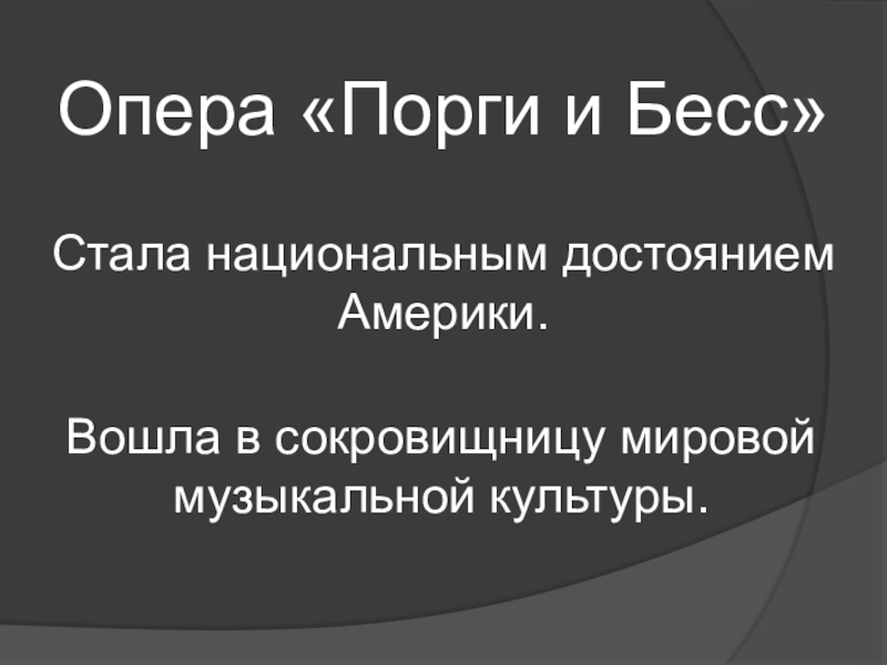 Опера «Порги и Бесс»Стала национальным достоянием Америки.Вошла в сокровищницу мировой музыкальной культуры.