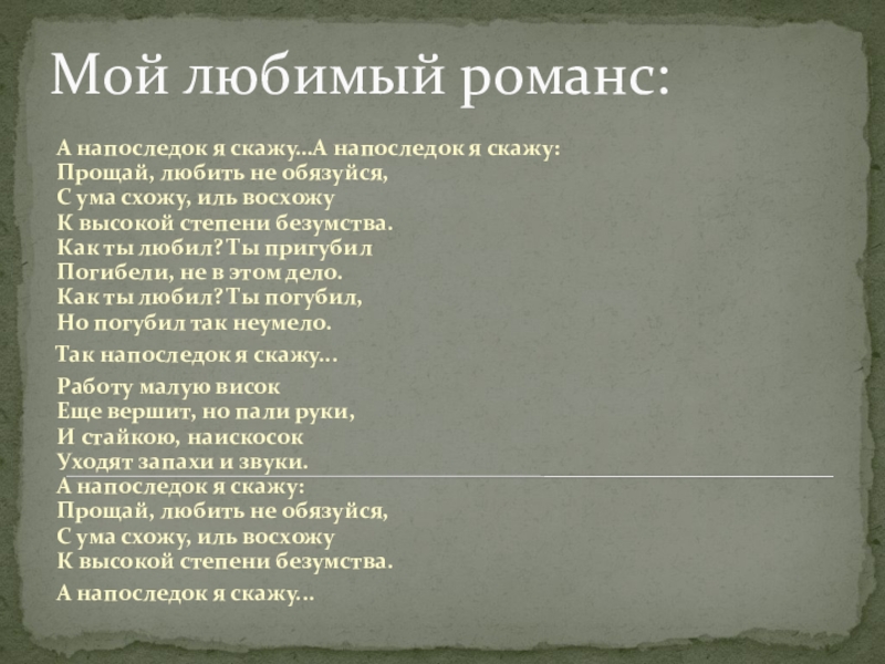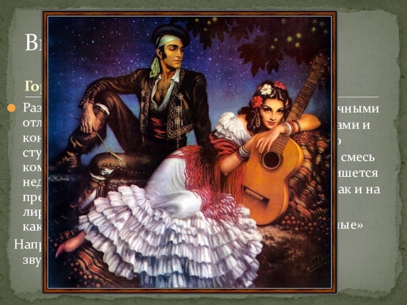 Романсы с специфичными цыганскими приемами и оборотами. Обычно представляет собой смесь романса и песни, пишется как на цыганском, так и на русском языке.