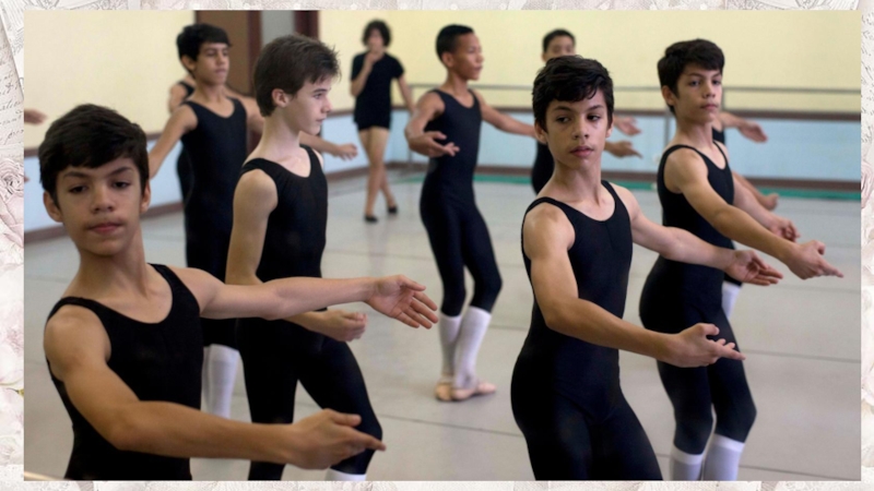 Слайд 13Юные танцовщики носят купальники с белыми колготами, на ногах чешки.