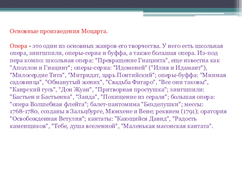 творчества. У него есть школьная опера, зингшпили, оперы-сериа и буффа, а также большая опера. Из-под пера компо: школьная опера: "Превращение Гиацинта", еще известна как "Аполлон и Гиацинт"; оперы-сериа: "Идоменей" ("Илия и Идамант"), "Милосердие Тита", "Митридат, царь Понтийский"; оперы-буффа: "Мнимая садовница", "Обманутый жених", "Свадьба Фигаро", "Все они таковы", "Каирский гусь", "Дон Жуан", "Притворная простушка"; зингшпили: "Бастьен и Бастьенна", "Заида", "Похищение из сераля"; большая опера: "опера Волшебная флейта"; балет-пантомима "Безделушки"; мессы: 1768-1780, созданы в Зальцбурге, Мюнхене и Вене; реквием (1791); оратория "Освобожденная Ветулия"; кантаты: "Кающийся Давид", "Радость каменщиков", "Тебе, душа вселенной", "Маленькая масонская кантата".