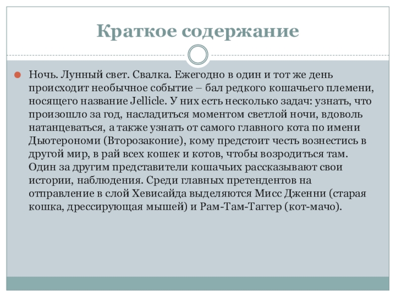 день происходит необычное событие – бал редкого кошачьего племени, носящего название Jellicle. У них есть несколько задач: узнать, что произошло за год, насладиться моментом светлой ночи, вдоволь натанцеваться, а также узнать от самого главного кота по имени Дьютерономи (Второзаконие), кому предстоит честь вознестись в другой мир, в рай всех кошек и котов, чтобы возродиться там. Один за другим представители кошачьих рассказывают свои истории, наблюдения. Среди главных претендентов на отправление в слой Хевисайда выделяются Мисс Дженни (старая кошка, дрессирующая мышей) и Рам-Там-Таггер (кот-мачо).