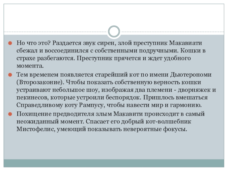 Похищение предводителя злым Макавити происходит в самый неожиданный момент. Спасает его добрый кот-волшебник Мистофелис, умеющий показывать невероятные фокусы.