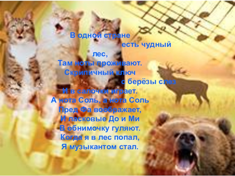 есть чудный лес, Там ноты проживают. Скрипичный ключ с берёзы слез И в салочки играет. А нота Соль, а нота Соль Пред Фа воображает, И ласковые До и Ми В обнимочку гуляют. Когда я в лес попал, Я музыкантом стал.