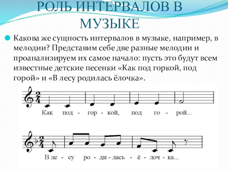 в мелодии? Представим себе две разные мелодии и проанализируем их самое начало: пусть это будут всем известные детские песенки «Как под горкой, под горой» и «В лесу родилась ёлочка».