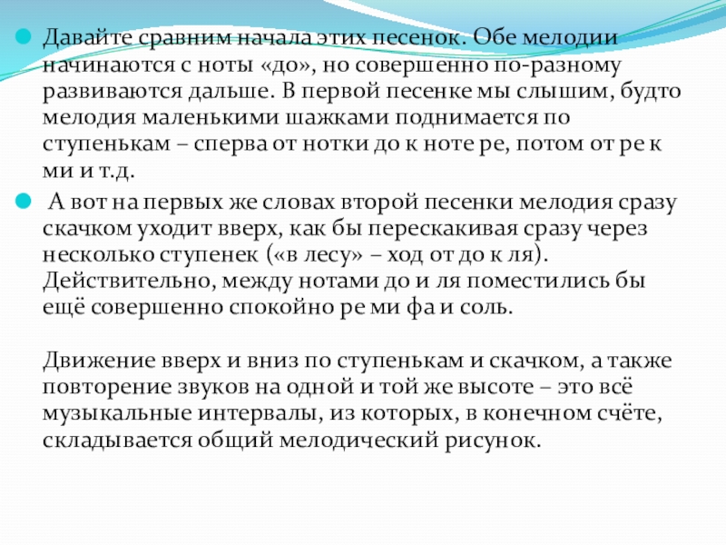но совершенно по-разному развиваются дальше. В первой песенке мы слышим, будто мелодия маленькими шажками поднимается по ступенькам – сперва от нотки до к ноте ре, потом от ре к ми и т.д.