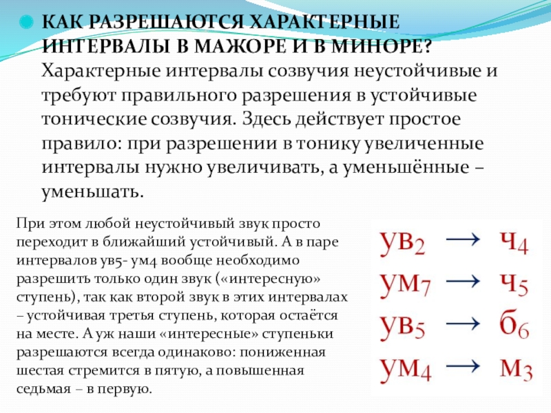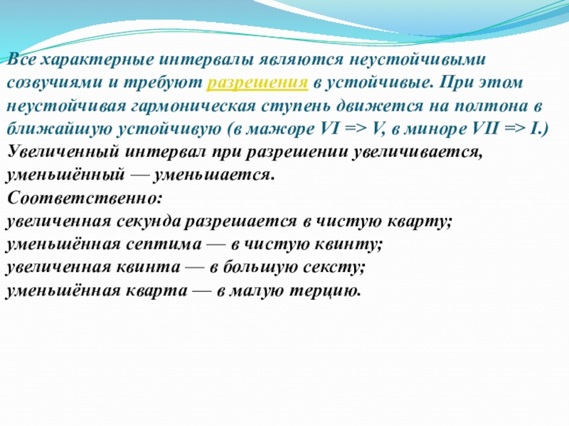 Слайд 16Все характерные интервалы являются неустойчивыми созвучиями и требуют разрешения в устойчивые. При этом