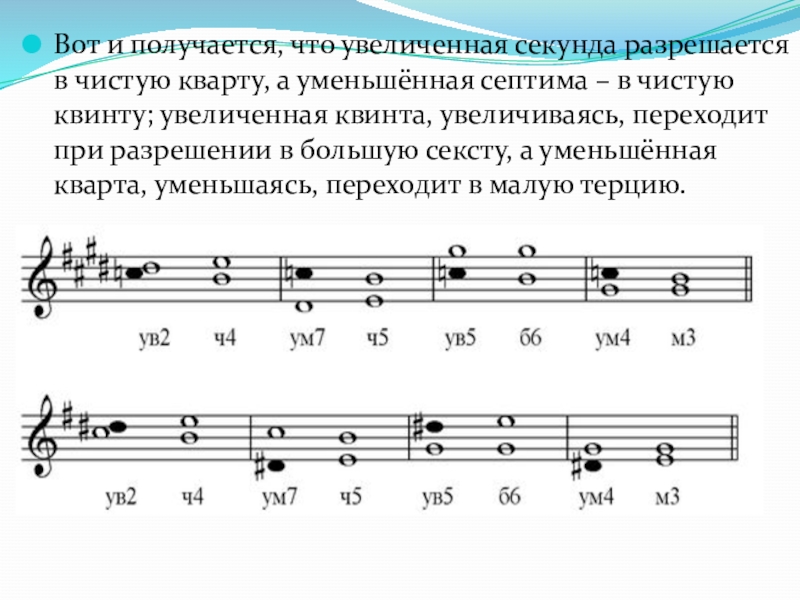 уменьшённая септима – в чистую квинту; увеличенная квинта, увеличиваясь, переходит при разрешении в большую сексту, а уменьшённая кварта, уменьшаясь, переходит в малую терцию.